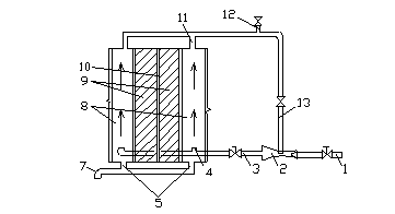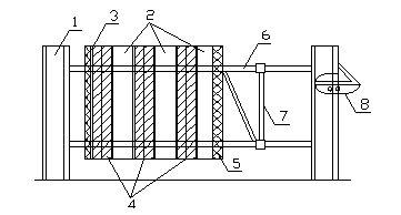Рисунок 2 – Схема кассетной установки 1 – станина; 2 – паровые отсеки (рубашки); 3 – разделительная стенка; 4 – отсек для формования изделия; 5 – теплоизолирующая стенка; 6 – фиксирующие упоры; 7 – механизм сжатия; 8 – механизм привода. Кассетные установки применяются для формования и тепловлажностной обработки панелей, лестничных маршей, ребристых плит и ряда других изделий, применяемых в строительстве. Как формование, так и тепловлажностная обработка осуществляются в кассетах в вертикальном положении. Масса сформованного бетона находится в кассете в замкнутом пространстве, что способствует более интенсивной тепловлажностной обработке. Форма-кассета (рис. 2) состоит из ряда отсеков, образованных стальными вертикальными стенками, причем отсеки, используемые для формования бетона, чередуются с отсеками для пара (паровая рубашка). Крайние отсеки теплоизолируют. Бетон подают в отсеки 4 и после уплотнения подвергают тепловой обработке. Для тепловой обработки пар подают в отсеки 2 и прогревают с двух сторон сразу два изделия, разделенные стальной перегородкой 3. Тепловлажностная обработка складывается из двух периодов: первый — прогрев, второй — изотермическая выдержка, после чего кассету разбирают, а изделия распалубливают. В кассетах изделия не охлаждают. Время тепловой обработки бетона в кассетах, составляет 6—8 ч, поэтому выгружают изделия с прочностью 50-60% проектной. Отправлять такие изделия на стройку невозможно, однако дальнейшая выдержка в кассетах приводит к снижению их оборачиваемости. Поэтому распалубленные изделия ставят в специальную яму-камеру вертикально, вплотную друг к другу. При этом изделия охлаждаются очень медленно и продолжают в течение 15—18 ч набирать прочность. К концу такого добора прочности они набирают так же, как и изделия, выгружаемые из камер, прочность, равную 0,7—0,75 марочной, и, согласно принятым нормам, могут быть отправлены на строительные площадки. Прогрев изделий через стенку в кассетах паром из-за большого расслоения температур по высоте 30—40°С затруднен, поэтому применяют эжекторное пароснабжение кассет. Схема такого пароснабжения показана на рис. 3. Пар из паропровода 1 подается в эжектор 2 и эжектирует паровоздушную смесь, отбираемую из паровых отсеков по трубопроводу 13. Смесь подается в паровые отсеки, отдает теплоту, а сама через трубопроводы 11 отбирается за счет разрежения, создаваемого эжектором. Часть отработанной смеси через трубопровод 12 выбрасывается в атмосферу. Такое пароснабжение кассетных установок дает возможность снизить неравномерность температур между верхом и низом кассет до 5—7°С, что вполне приемлемо для тепловлажностной обработки. Обогревают изделия в кассетах через металлическую разделительную стенку, верх изделия на время тепловой обработки изолируют. Таким образом, массообмена между теплоносителем и материалом и материалом и окружающей средой практически не происходит. Наиболее выгоден и прост в исполнении электрообогрев. В этом случае в паровые отсеки вместо подачи пара монтируют ТЭНы или любые другие электронагреватели и уже ими через стенку нагревают бетон. При любом способе изделия из бетона нагревают до 80—90 °С в течение 1,5—2 ч и далее выдерживают при этой температуре 4—6 ч. Расход в кассетах пара или любого другого источника теплоты в пересчете н