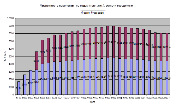 Министерство общего и профессионального образования Свердловской области Асбестовский городской окру Асбестовское муниципальное общеобразовательное учреждение основная общеобразовательная школа № 12. тема: Характеристика населения Свердловской области. Демографические проблемы г. Асбест 2008 год Введение Свердловская область одна из наиболее развитых областей России. Население области это простые люди, мужчины и женщины, являются самым главным богатством нашего региона. Ведь именно люди выплавляют металл, лечат и учат детей, выращивают хлеб и делают все, что нужно для поддержания жизни. Поэтому я считаю, что будет интересно рассмотреть такой вопрос, как «Характеристика населения Свердловской области. Демографические проблемы». Мне кажется, что это нужно знать для того, чтобы знать историю и для того, чтобы посмотреть на это со стороны и подумать, что же происходит с населением Свердловской области. Цель моей работы: составить характеристику населения Свердловской области, изучить демографические проблемы. Задачи: 1) изучение динамики численности населения Свердловской области, половозрастной структуры и этнического состава населения, особенности его расселения; 2) выявление демографических проблем Свердловской области; 3) определение путей решения демографических проблем. Глава 1. Динамика численности населения В настоящее время численность населения Свердловской области составляет 4 млн. 489,8 тыс. человек. По сравнению с 1995 годом численность населения сократилась почти на 211 тысяч человек. Изменение численности населения в разные годы было неодинаковым. Например, наибольший прирост населения наблюдался до конца 50-х годов. В этот период проходил процесс индустриализации, что сопровождалось интенсивным ростом городского населения. Посмотрим на график, из которого мы видим как изменялась численность населения Свердловской области, начиная с 1926 года и до наших дней.