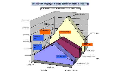 Из графика видно, что до 40-45 лет количественный состав мужчин и женщин примерно одинаковый. Далее число мужчин резко уменьшается. Если посмотреть на возраст 65 лет и выше, то число женщин остается примерно в двое большим , чем мужчин. Давайте посмотрим на соотношение мужчин и женщин в 2002 году, когда проводилась перепись населения. В 2002 году по данным переписи населения происходят некоторые изменения в соотношении числа мужчин и женщин. Теперь уже в более раннем возрасте наступает дисбаланс в составе мужчин и женщин (36-39 лет). Уменьшение численности мужчин связано со многими факторами, в том числе и с вредными условиями труда, неблагоприятной экологической обстановкой, пристрастиями к вредным привычкам, например: курение, алкоголь. Кроме того, высокая заболеваемость различными болезнями, например, сердечно-сосудистые заболевания, заболевания органов пищеварения, и т.д. Мы также видим, что продолжительность жизни как у мужчин, так и у женщин не очень высокая. 2.2 Возрастная структура Анализ возрастной структуры населения Свердловской области показывает, что её изменение идет в двух направлениях: во-первых, уменьшается доля детей; во-вторых, значительно растет удельный вес пожилых. Это явление называется постарением населения, и связано оно со снижением рождаемости. Особенно высок удельный вес пожилых в сельской местности.