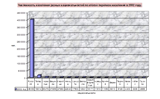2.3 Этнический состав Национальный состав населения Свердловской области в известной степени отражает многонациональность России. На территории нашей области проживает около 90 национальностей. Основная часть населения – русские (88,7 % ). Здесь живут также татары (3,9 %), украинцы (1,8%), башкиры (0,9%), немцы (0,7%), марийцы (0,7%), белорусы (0,6%), удмурты (0,5%), чувыши (0,3%), мордва (0,3%) и другие. В настоящее время русские составляют большинство населения области – 88,7 %, в городах – 89,3 %, среди сельского населения – 85,3 %. Наиболее «русскими» являются юго-восточные и восточные районы области, а также территории, прилегающие к городам Нижний Тагил и Верхотурье. Именно эти территории изначально заселялись русскими. Повсеместно расселены по территории области татары, но это в основном потомки поволжских татар, которые стали селиться в бассейне среднего течения реки Уфы в XV столетии. По численности сейчас татары занимают второе место после русских. Особенно значителен удельный вес татарского населения в местах их традиционного расселения: Красноуфимский район – 18,9 %, Нижнесергинский район – 12,7 %, Ачитский район – 8,9 %. В этих районах сохраняются ареалы сплошного татарского заселения. Довольно высок удельный вес татарского населения в южной части Горнопромышленного района. Так, в Екатеринбурге и его агломерации проживает около 65 % всего татарского населения области. Третье место по численности занимают украинцы. Живут они в основном в городах Горнопромышленного района и являются потомками переселенцев XVIII в. И более позднего времени: годы первых пятилеток и Великой Отечественной войны. Немцы – четвертый по численности народ области. Проживают они в основном в северных городах, составляя там значительный удельный вес, например в Краснотурьинске – 11, 5 %, Карпинске – 8,2 %, Ивделе – 4 %. В трех названных городах проживает около половины немцев области. Переселены они были сюда из Поволжья во время сталинских репрессий. Сейчас их численность уменьшается из-за значительной эмиграции: за 10 лет (1979-1989) абсолютное сокращение составило 2,1 тыс. человек. Одновременно с татарами в бассейне среднего течения реки Уфы появились марийцы. В настоящее время они компактно проживают в Красноуфимском районе (15 % от общей численности населения), в Ачитском районе (14,3 %), в Артинском районе (6,7 %). Рассмотрим таблицу, из которой видно, что в Свердловской области живет много национальностей, но преобладает русское население.