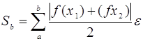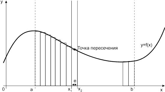Рис. 1.3.3. Метод средних прямоугольников. По методам трапеций и средних прямоугольников соответственно интеграл равен сумме площадей прямоугольных трапеций, где основание трапеции какая-либо малая величина (точность), и сумма площадей прямоугольников, где основание прямоугольника какая-либо малая величина (точность), а высота определяется по точке пересечения верхнего основания прямоугольника, которое график функции должен пересекать в середине. Соответственно получаем формулы площадей — для метода трапеций: