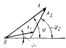 Рисунок 1- Векторна діаграма складання двох коливань Найпростіший випадок - інтерференція двох монохроматичних світлових хвиль, що однакові по частоті, поляризації і напрямку розповсюдження (рис. 1), зводиться до додавання комплексних амплітуд (див. гл. 1, с. 12) у заданій точці простору: U = U1 + U2, де U1= A1 exp (ij1); U2 = A2 ехр (ij2). Речовинну амплітуду і початкову фазу результату інтерференції знаходять відомим прийомом множення на величину, комплексно з'єднану комплексній амплітуді: А2 = A12 + А22 + 2A1A2cos(j2+j1); (1) tg j = (A1 sin j1 + A2 sin j2)/(А1 cos j1 + A2cos j2). З формули (1) випливає, що амплітуда А, а отже, і інтенсивність, і результат інтерференції залежать від різниці фаз j2 - j1 = dj: I = I1 + I2 + Екстремальні значення результуючої інтенсивності виходять такими: Imax = ( Imax = ( де m- ціле число (m = 0, ±1, ±2, ± ...). Якщо I1 = I2, то Imax = 4I1, Imin = 0 (рис. 2).