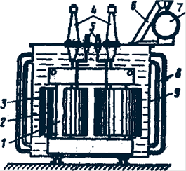 Министерство образования и науки Украины Украинская инженерно-педагогическая академия Кафедра электроэнергетики Самостоятельная работа по теме: "Классификация трансформаторов" Харьков 2010 Трансформатор - представляет собой статический электромагнитное устройство с двумя (или больше) индуктивно связанных обмотками, предназначенный для преобразования (посредством электромагнитной индукции ) переменного тока одного напряжения в переменный ток другого. Трансформаторы широко применяются при передаче электрической энергии на большие расстояния, распределении ее между приемниками, а также в различных выпрямительных, усилительных, сигнализационных и других устройствах. Классификация силовых трансформаторов напряжения Трансформаторы напряжения различаются: а) по числу фаз — однофазные и трехфазные; Силовые трансформаторы выпускаются в основном в трехфазном исполнении. Для применения в однофазных сетях выпускаются однофазные трансформаторы. б) по числу обмоток — двухобмоточные и трехобмоточные; Трансформаторы имеют две или несколько обмоток, индуктивно связанных друг с другом. Обмотки, потребляющие энергию из сети, называются первичными. Обмотки, отдающие электрическую энергию потребителю, называются вторичными. в) по классу точности, т. е. по допускаемым значениям погрешностей; г) по способу охлаждения — трансформаторы с масляным охлаждением (масляные), с естественным воздушным охлаждением (сухие и с литой изоляцией); д) по роду установки — для внутренней установки, для наружной установки и для комплектных распределительных устройств (КРУ). е) по конструкции -силовые трансформаторы делят на два основных типа — масляные и сухие. В масляных трансформаторах магнитопровод с обмотками находится в баке, заполненном трансформаторным маслом, которое является хорошим изолятором и охлаждающим агентом. Сухие трансформаторы охлаждаются воздухом. Они применяются в жилых и промышленных помещениях, в которых эксплуатация масляного трансформатора является нежелательной. Трансформаторное масло является горючим, и при нарушении герметичности бака масло может повредить другое оборудование. е)По назначению - трансформаторы разделяют на силовые общего и специального применения. Силовые трансформаторы общего применения используются в линиях передачи и распределения электроэнергии. Для режима их работы характерна частота переменного тока 50 Гц и очень малые отклонения первичного и вторичного напряжений от номинальных значений. К трансформаторам специального назначения относятся силовые специальные (печные, выпрямительные, сварочные, радиотрансформаторы), измерительные и испытательные трансформаторы, трансформаторы для преобразования числа фаз, формы кривой ЭДС, частоты и т.д. Трансформатор с масляным охлаждением В трансформаторах с масляным охлаждением магнитопровод с обмотками помещен в бак, наполненный трансформаторным маслом (рис. 1). Омывая обмотки 2 и 3, магнитопровод 7, трансформаторное масло отбирает от них тепло и, обладая более высокой теплопроводностью, чем воздух, через стенки бака 9 и трубы радиатора 8 отдает его в окружающую среду. Наличие трансформаторного масла обеспечивает более надежную работу высоковольтных трансформаторов, так как электрическая прочность масла намного выше, чем воздуха. Масляно