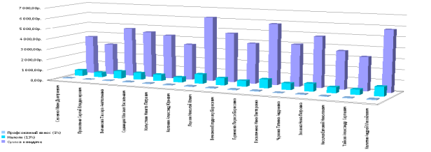 6 Построение диаграммы По заданию необходимо отобразить графически сумму к выдаче, налоги и профсоюзные взносы. Для этого создается диаграмма, которая отображает сумму к выдаче, налоги и профсоюзные взносы. Вид диаграмм – гистограмма обычная. OpenOfficeCalcпозволяет создавать диаграммы различных типов. Диаграммы создаются с помощью «Мастера диаграмм». Для вызова «Мастера диаграмм» следует выбрать в меню «Вставка» команду «Диаграмма». Для создания диаграммы в открывшемся окне выбирается тип диаграммы – «Гистограмма обычная», после чего нажимается «Далее». В новом указывается диапазон ячеек А1:J16. Ряды следует выбрать «В столбцах». Затем открывается вкладка «Ряды данных» и удаляются все кроме суммы к выдаче, налогов и профсоюзных взносов. В диапазоне для значения Yвыбираются ячейки диапазона G2:G16, а для категории ячейки A2:А16, после чего нажимается «Далее». В строке заголовка вводится название таблицы - «Сумма к выдаче, налоги и профсоюзные взносы». Диаграмма создается на отдельной странице. Далее проставляется галочка в пункте «Показывать легенду». Созданная диаграмма приведена на Рисунке 3.