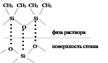 б Рисунок 3 – Схема адсорбции полидиметилсилоксана на необработанной (а) и обработанной (б) поверхности стекла. 2. Влияние растворителя. Растворитель определяет размеры макромолекулы в растворе, ее ассиметрию и, следовательно, возможную ориентацию молекулы на поверхности, структуру адсорбционного слоя и т.п. Необходимо также принимать во внимание адсорбцию самого растворителя на поверхности, которая мешает сделать правильные выводы об адсорбции макромолекулы. Связь между взаимодействием полимера и растворителя и размерами цепи выражается уравнением Флори-Хаггинса, в основе которого лежит представление об осмотическом давлении статистического клубка макромолекулы [1]: