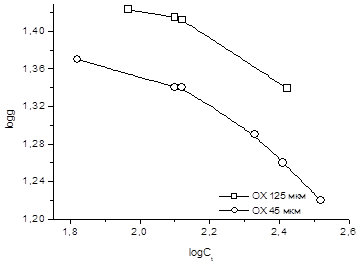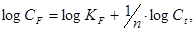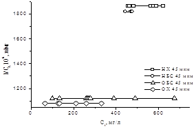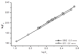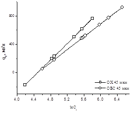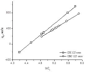 где СF – концентрация сорбированного полимера; Ct - равновесная концентрация полимера, оставшегося в растворе в момент времени t; KF и 1/n – константы, определяемые отрезком на оси ординат, отсекаемым касательной, проведенной к начальному участку кривой, и углом наклона, соответственно. Изотерма Темкина [30] описывает линейную зависимость: