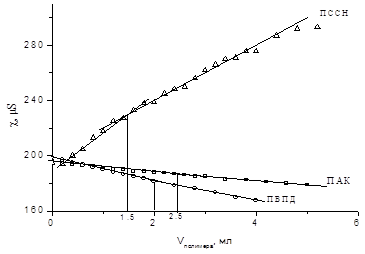 Рисунок 6 – Кондуктометрическое титрование 20 мл геллана (С = 1,5·10-3 М) растворами полимеров Из рисунка 6 видно, что точка перегиба кривой приходится на объем ПАК V=2,5 мл, то есть для того, чтобы оттитровать 1 мл геллана требуется 2,5 мл 2,5·10-2
