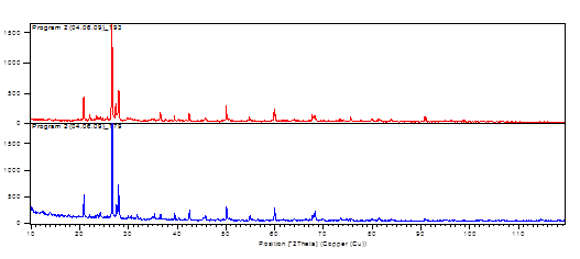 Рисунок 11 – Рентгеновская дифрактограмма керна из месторождения Харасан «до» (779) и «после» (793) активации поверхности горячей HCl Известно, что адсорбция полимеров на поверхности обуславливается как электростатическими, так и специфическими химическими силами [31]. На рисунке 12 представлены графики зависимости концентрации адсорбированного на кернах полимеров от времени контакта. Скорость адсорбции полимеров зависит от молекулярной массы полимера и типа адсорбента. Для непористых адсорбентов характерно быстрое установление равновесия. Поскольку используемые в работе керны не содержат пор, а только лишь шероховатости на поверхности, то и в нашем случае адсорбция протекает очень быстро – в течение нескольких минут. На рисунке 12 видно, что на предварительно активированном HCl керне сорбируется большее количество геллана, поскольку создание дополнительных активных центров способствует лучшей адсорбции полимера.