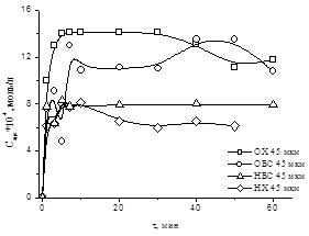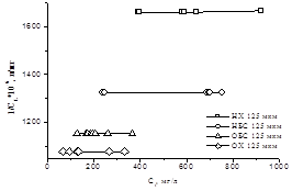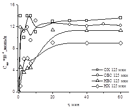Рисунок 12 – Кинетика адсорбции геллана на поверхности кернов. СGel =1,5·10-3 моль/л, Т=298К Также наблюдается некоторое падение значения концентрации адсорбированного полимера после насыщения. Из литературных данных известно [30], что с кинетической точки зрения адсорбция является обратимым процессом, то есть одновременно с адсорбцией происходит и десорбция. В начале процесса скорость адсорбции больше, чем скорость десорбции. По мере насыщения поверхности адсорбента устанавливается состояние адсорбционного равновесия, которое характеризуется равенством скоростей адсорбции и десорбции. При адсорбции геллана на 125 фракциях десорбция не наблюдается. Из этого следует, что геллан прочнее держится на более крупных частичках керна, что связано, с его высокой молекулярной массой и строением звена. Тогда как с более мелких частичек смыть полимер гораздо легче. На рисунке 13 приведены адсорбционные емкости обработанного керна месорождения Харасан. Адсорбционная емкость керна показывает, какое количество полимера адсорбируется на 1 г керна. Из графика видно, что 125 фракция Харасана проявляет большую способность адсорбировать геллан.