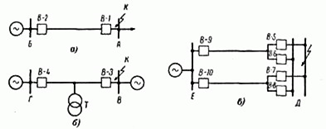 Рис. 1 Схемы электрических соединений Повреждения на шинах могут быть отключены без специальной защиты шин резервными защитами линий, установленными на соседних подстанциях. Так, например, при коротком замыкании на шинах подстанции А (рис. 1, а) подействуют резервные защиты на подстанции Б и отключат выключатель В-2, отделяя поврежденный участок от остальной сети. Отключение при этом, конечно, происходит с выдержкой времени резервной защиты, а не мгновенно, как при наличии специальной защиты шин. Замедление в отключении приводит к увеличению размеров повреждения в месте короткого замыкания, а в кольцевых сетях может вызвать нарушение устойчивости параллельной работы. Поэтому подстанции 110—500 кВ в кольцевых сетях с многосторонним питанием, как правило, оснащаются специальными защитами шин. На тупиковых же подстанциях защита шин обычно не устанавливается, и повреждения, возникающие на них, отключаются резервными защитами линий на питающих подстанциях. Специальные защиты шин позволяют также селективно отключить поврежденный участок и предотвратить нарушение электроснабжения дополнительных подстанции. Так, например, в схеме, приведенной на рис. 1, б) в случае короткого замыкания на шинах подстанции В, при срабатывании резервных защит и отключении выключателя В-4 одновременно с поврежденной подстанцией будет отключен и трансформатор Т, подключенный ответвлением к линии. При наличии на подстанции В специальной защиты шин рассматриваемое повреждение будет отключаться выключателем В-3, и питание трансформатора Т сохранится от подстанции Г. Аналогично в схеме на рис. 1, в) при повреждении на одной из систем шин подстанции Д она будет селективно отключена защитой шин, а вторая система шин сохранится в работе. В случае отсутствия защиты шин короткое замыкание будет ликвидироваться отключением выключателей В-9 и В-10, что приведет к погашению обеих систем шин подстанции Д. Таким образом, специальные защиты шин целесообразно применять для ускорения отключения повреждений и повышения селективности. Дифференциальная защита шин Принцип действия Токовые реле (рис.2) подключаются к соединенным параллельно вторичным обмоткам трансформаторов тока, установленных на каждом присоединении. Коэффициенты трансформации всех трансформаторов тока равны.