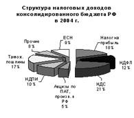 Рис. 1.1 Структура налоговых доходов консолидированного и федерального бюджета России за 2004 г. (источник – данные Минфина РФ) Налоговая ставка устанавливается в размере 24 процентов, за исключением случаев, предусмотренных пунктами 2 - 5 статьи 284. При этом: сумма налога, исчисленная по налоговой ставке в размере 6,5 процента, зачисляется в федеральный бюджет; сумма налога, исчисленная по налоговой ставке в размере 17,5 процента, зачисляется в бюджеты субъектов Российской Федерации. Нормативно-правовые акты: - НК РФ, глава 25 (ред. от 27.07.2006) - Закон РФ "О федеральном бюджете на 2007 год" - Закон Санкт-Петербурга от 28.06.1995 N 81-11 (ред. от 09.10.2006) 1.2 Субъекты налога Статья 246 НК РФ. Налогоплательщиками налога на прибыль организаций признаются: - российские организации; - иностранные организации, осуществляющие свою деятельность в Российской Федерации через постоянные представительства и (или) получающие доходы от источников в Российской Федерации 1.3 Объекты налога Статья 247 НК РФ. Объектом налогообложения по налогу на прибыль организаций признается прибыль, полученная налогоплательщиком. Прибылью в целях настоящей главы признается: 1) для российских организаций - полученные доходы, уменьшенные на величину произведенных расходов, которые определяются в соответствии с данной главой; 2) для иностранных организаций, осуществляющих деятельность в Российской Федерации через постоянные представительства, - полученные через эти постоянные представительства доходы, уменьшенные на величину произведенных этими постоянными представительствами расходов, которые определяются в соответствии с данной главой; 3) для иных иностранных организаций - доходы, полученные от источников в Российской Федерации. Доходы указанных налогоплательщиков определяются в соответствии со статьей 309 НК РФ. 1.4 Налоговая база и порядок ее определения Статья 274 НК РФ. О налоговой базе переходного периода см. Федеральный закон от 6 августа 2001 г. N 110-ФЗ 1. Налоговой базой признается денежное выражение прибыли, определяемой в соответствии со статьей 247 НК РФ, подлежащей налогообложению. 2. Налоговая база по прибыли, облагаемой по ставке, отличной от ставки, указанной в пункте 1 статьи 284 НК РФ, определяется налогоплательщиком отдельно. Налогоплательщик ведет раздельный учет доходов (расходов) по операциям, по которым в соответствии с данной главой предусмотрен отличный от общего порядок учета прибыли и убытка. 3. Доходы и расходы налогоплательщика в целях настоящей главы учитываются в денежной форме. 4. Доходы, полученные в натуральной форме в результате реализации товаров (работ, услуг), имущественных прав (включая товарообменные операции), учитываются, если иное не предусмотрено НК РФ, исходя из цены сделки с учетом положений статьи 40 НК РФ. 5. Внереализационные доходы, полученные в натуральной форме, учитываются при определении налоговой базы исходя из цены сделки с учетом положений статьи 40 НК РФ, если иное не предусмотрено данной главой. Федеральным законом от 7 июля 2003 г. N 117-ФЗ в пункт 6 статьи 274 НК РФ внесены изменения, вступающие в силу с 1 января 2004 г. 6. Рыночные цены определяются в порядке, аналогичном порядку определения рыночных цен, установленному абзацем 2 пункта 3, а также пунктами 4-11 статьи 40 НК РФ, на момент реализации или совершения внереализационных операций (без включения