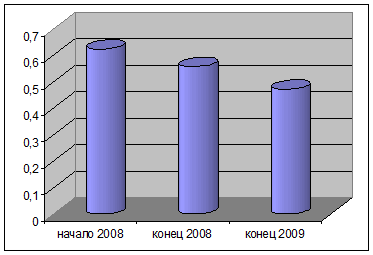 Результаты расчетов по ООО «Промэнергозащита» показывают, что в этой организации сопоставления итогов групп по активу и пассиву имеет следующий вид: на 2008 год (начало) – (Л1<П1,Л2>П2,Л3>П3,Л4>П4); на 2008 год (конец) – (Л1<П1,Л2>П2,Л3>П3,Л4>П4); на 2009 год – (Л1<П1,Л2>П2,Л3>П3,Л4>П4). Из таблицы следует, что нарушены два условия ликвидности. Во-первых, наиболее срочные обязательства намного превышают наиболее ликвидные активы (на 449,3 тыс.грн в начале 2008 года, на 406,2 тыс. грн в конце 2008 года и на 445,8 тыс. грн. в 2009). Во-вторых, наблюдается платежный недостаток по четвертой группе –76,1 тыс. грн на начало 2008 года, 23,5 тыс. грн в конце 2008 и уже 147,6 тыс. грн в 2009. Тенденция к повышению, а значит, ситуация угрожающая. По данным баланса ООО «Промэнергозащита» рассчитаем коэффициент общей ликвидности, который показывает, в какой степени имеются оборотные активы достаточные для удовлетворения текущих обязательств. Согласно общепринятым стандартам, считается, что этот коэффициент должен находиться в пределах от 2 до 2.5. Используя классификацию активов и пассивов, приведенную выше, формулу для определения коэффициента общей ликвидности можно представить в следующем виде: Кобщ(тек)=Л1+Л2+Л3 / П1+П2 2008 год (начало) Кобщ (тек)=(3,2+345,0+161,0)/(452,5+105,6)=0,912 2008 год (конец) Кобщ (тек)=(16,3+254,7+193,3)/ (422,5+65,3)=464,3 /487,8 = 0,952. 2009 год. Кобщ (тек)=(79,6+201,6+167,1)/(525,4+70,5) = 448,3 / 595,9 = 0,752 . Расчет показывает, что предприятие не может покрыть своей текущей задолженности полностью, причем в начале 2008 года не хватало 8,9%, в конце 2008 не хватало всего 4,8%, а в 2009 уже почти 25%. Тенденция к ухудшению финансовой устойчивости предприятия в 2009 году, однако наблюдался рост в 2008. Промежуточный (уточненный) коэффициент ликвидности считается более жестким тестом на ликвидность, поскольку при его расчете не берется во внимание менее всего ликвидная часть оборотных активов – медленно реализованные активы. Ксроч=Л1+Л2 / П1+П2; 2008 год. (н) Ксроч=(3,2+345,0)/(452,5+105,6)=0,624 2008 год. (к) Ксроч =(16,3+254,7)/(422,5+65,3)=271,0/487,8=0,556 2009 год. Ксроч = (79,6+201,6)/(525,4+70,5) = 281,2 / 595,9= 0,472. Для большей наглядности динамика коэффициента срочной ликвидности показана на диаграмме (рис. 4.1). Рис. 4.1. Динамика коэффициента срочной ликвидности.