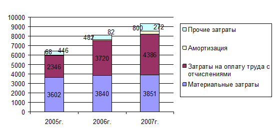 Рис. 2. Состав затрат для услуг водоотведения Подвергнем анализу приведенные цифровые и графические данные. Рассмотрим структуру и динамику элементов затрат по услугам водоснабжения.Наибольший удельный вес в структуре затрат имеетзатраты на оплате труда за последний год также возросли, их доля в общей сумме затрат на производство увеличилась – на 5%, за счет повышением заработной платы и увеличение численности. Удельный вес в структуре материальных затраты в 2007 году составляет 41,3% доли всех затрат. При этом наметилась динамика увеличения данного показателя на 5,9%. Увеличение материальных затрат на 0,3% произошло за счет удорожания ГСМ, замена на более дорогостоящие полиэтиленовые трубы.Величина амортизационных отчислений возросла в 2007 г. по сравнению с 2006 г. на 231,7%, при этом их доля повысилась на 0,02%.Прочие затраты на производство возросли на 66%, их доля в сумме затрат на производство возросли почти – на 2,66%.В целом затраты на услуги водоснабжения в 2007 г. в сравнении с 2006 г. повысились на 14,6%, а в 2006 г. в соотношении к 2005 г. на 25,7%. Доля затрат на услуги водоснабжения в общей сумме затрат выше, чем доля затрат водоотведения и составляет в 2007 году – 47,8%. Рассмотрим структуру и динамику затрат для услуг водоотведения Наибольший удельный вес в структуре затрат также имеют материальных затраты в 2007 году их доля составила 66,36%, за последний год их величина возросла на 4,4%. Затраты на оплату труда работников, занятых водоотведения, за последний год повысилось на 30,7%, их доля в общей сумме затрат водоотведения уменьшается – на 2,09%. Это обусловлено за счет удорожания ГСМ, запасных частей и повышение заработной платы. Величина амортизационных отчислений увеличилось в 2007 г. по сравнению с 2006 г. 160%, их доля не изменилась, составляет – 0,01%. В целом затраты для услуг водоотведения в 2007 г. по сравнению с 2006 г. возросли на 41,7%, а в 2006 г. наблюдается повышение затрат на 149,8%.Следует отметить, что по большинству элементов затрат в анализируемом периоде, наблюдается повышение. Это объясняется ростом цен на топливо, запасные части, услуги сторонних организаций, цены на которые увеличиваются более быстрыми темпами, чем рост реализации водоснабжения и водоотведения Общества. Таблица 10. Анализ динамики себестоимости основных видов деятельности