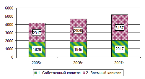 Как видноиз таблицы 12, пассивная часть баланса характеризуется преобладающим удельным весом собственных источников средств, однако их доля в общем объеме сокращается с 44,10% в 2005 г. до 38,98% в 2007 г., что свидетельствует об усилении зависимости Общества от заемных средств. Заемные средства представлены преимущественно кредиторской задолженностью и её величина в 2007 г. увеличилась на 6,86%. Основные кредиторы: ООО «ПромВодСнаб», МУП «КОС», ООО «УККТС». Долгосрочные и краткосрочные кредиты и займы имели место в 2005 г. и 2007 г., но их доля в общей величине заемных средств не значительна: 17,13% и 9,47% соответственно. Соотношение собственных и заемных источников средств формирования имущества предприятия представлено на рисунке 2.