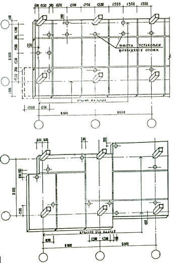 3.2.6. При несимметричности опираемых панелей, либо одностороннем приложении к ним нагрузок, что, как правило, бывает на крайних осях здания, необходима установка монтажных стоек в местах, показанных на чертеже. Стойки снимаются только после того, как перекрытие следующего (с аналогичной установкой стоек) этажа смонтировано, замоноличено и бетон замоноличивания набрал не менее 70% проектной прочности.