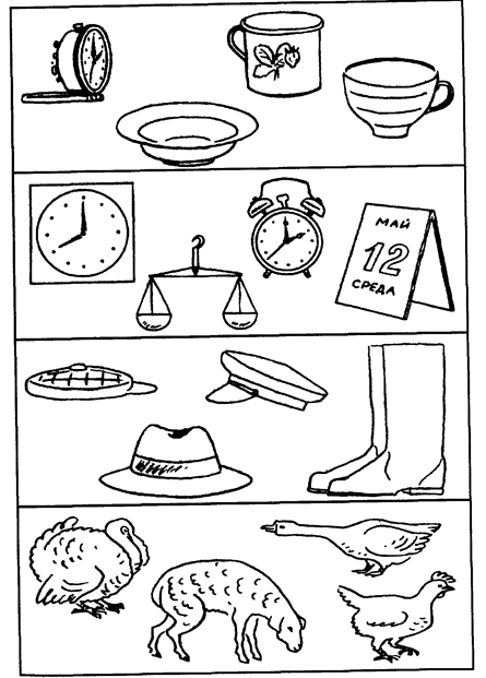 Рис. 6 - Картинки к методике «Времена года»Методика «Что здесь лишнее?»Эта методика предназначена для детей от 5 до 6 лет и дублирует предыдущую для детей этого возраста. Она призвана исследовать процессы образно-логического мышления, умственные операции анализа и обобщения у ребенка. В методике детям предлагается серия картинок (рис. 7), на которых представлены разные предметы, в сопровождении следующей инструкции: «На каждой из этих картинок один из четырех изображенных на ней предметов является лишним. Внимательно посмотри на картинки и определи, какой предмет и почему является лишним». На решение задачи отводится 3 минуты. Оценка результатов