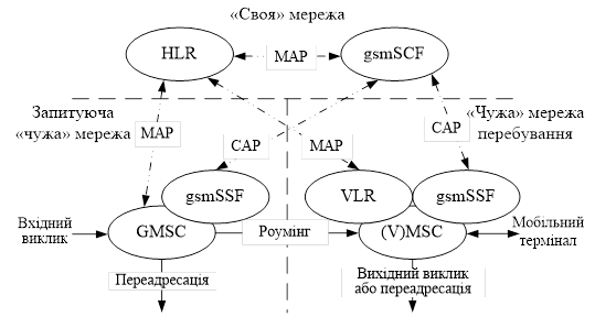 Рисунок 4 – Функціональна архітектура першої фази стандарту CAMEL Під час обробки вхідних/вихідних викликів, які вимагають підтримки САМЕL у напрямку від/до іншої мережі, шлюзовий центр комутації рухомого зв'язку GMSC (Gateway MSC) запитує від HLR інформацію про наявність підписки абонента на послуги CAMEL. Якщо підписка існує, GMSC запитує у gsmSSF необхідні інструкції. На основі отриманих інструкцій GMSC відслідковує зміни станів процесу обслуговування виклику та інформує про них gsmSSF, дозволяючи тим самим gsmSSF управляти обслуговуванням виклику в GMSC. Інтерфейс між GMSC і gsmSSF є внутрішнім. При виявленні запиту послуги gsmSSF інформує про це gsmSCF. Регістр місцезнаходження «чужих» абонентів (VLR – VisitorLocationRegister) зберігає інформацію про підписку CAMEL при вихідному виклику, а також інформацію про підписку на додаткові послуги як частину даних про «чужих» абонентів, які перебувають в обслуговуваній цим VLR зоні. При вихідному внутрішньомережному виклику MSC отримує від VLR інформацію про наявність підписки абонента на послуги CAMEL. Наявність підписки вказує (V) MSC (MSC «чужої» мережі) на необхідність обміну інструкціями з gsmSSF. Під час обробки запиту додаткової послуги (V) MSC одержує від VLR інформацію про те, що абонент на неї підписаний, що вказує gsmSSF на необхідність інформувати gsmSCF про запит послуги. Інтерфейс HLR – VLR використовується для передачі інформації про абонента в «чужу» мережу GSM і для надання номера рухомого абонентського термінала під час роумінгу. За допомогою цього інтерфейсу також визначаються дані про статус і місцезнаходження рухомого абонента, визначається необхідність скасування іншомовних повідомлень для послуг CAMEL, і передаються вказівки скасувати ці повідомлення. Інтерфейс GMSC – HLR використовується при вхідних викликах для обміну інформацією про маршрутизацію, про статус і місцезнаходження абонента, а також інформацією про поточну підписку абонента на послуги та про необхідність скасування іншомовних повідомлень автоінформатора. Цей інтерфейс також використовується для передачі у запитуючу мережу GSM інформації про підписку абонента на послуги CAMEL при вхідному та вихідному викликах. Інтерфейс gsmSSF – gsmSCF використовується для обміну інструкціями в процесі обслуговування виклику та для передачі запитів з'єднання з gsmSRF. На відміну від IN CS-1 і CS-2, інтерфейс gsmSSF – gsmSCF призначений також і для міжмережної (міжнародної) взаємодії. Інтерфейс gsmSCF – HLR використовується функціональним об'єктом gsmSCF для запиту інформації від HLR. Передбачається, що HLR може відмовити в наданні інформації, яку запитує gsmSCF. Інтерфейс gsmSCF – gsmSRF застосовується в другій фазі реалізації стандарту CAMEL і використовується gsmSCF для пересилання функціональному об'єкту gsmSRF інструкцій про передачу користувачу акустичних сигналів або мовних повідомлень. Інтерфейс MSC – gsmSCF використовується MSC для повідомлення gsmSCF про запит користувачем додаткових послуг. Інтерфейси GMSC – gsmSSF і (V) MSC – gsmSSF є внутрішніми та призначені лише для того, щоб полегшити розуміння процесу обробки точок виявлення DP. ITU-T продовжує роботу над стандартами для систем рухомого зв'язку третього покоління, архітектура яких використовуватиме принципи побудови IN. Стандарт IMT-2000 призначений для підтримки широкого спектра послуг (включаючи мультимедійні), принципи надання яких будуть засновані на концепції IN. Функціонал