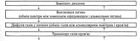 III. Домашнє завдання. Вивчити § 33. Поміркуйте: 1). У чому полягає біологічне значення появи у ссавців альвеол і збільшення їх кількості у людини. 2). У період внутрішньоутробного розвитку в людини формуються легені у вигляді мішечків з гладенькими стінками. Бронхи і легеневі пухирці розвиваються пізніше. Про що це свідчить? Газообмін у легенях і тканинах. Значення газообміну та клітинного дихання для організму Освітні цілі: показати значення газообміну в легенях і тканинах, роль дифузії в цих процесах; на прикладі дифузії газів показати взаємодію біологічних і фізичних явищ в організмі; зробити висновок про необхідність громадської боротьби за чисте повітря та додержання правил особистої гігієни дихання. Основні поняття і терміни: газообмін, вдихуване (видихуване, альвеолярне повітря), дифузія, парціальний тиск, газообмін, оксигемоглобін, артеріальна (венозна) кров. Обладнання: дихальні клапани, моделі будови легень, гортані. Структура уроку, основний зміст і методи роботи. I. Актуалізація опірних заннь. Перевірка знань про голосовий апарат. (Розповіді учнів з використанням таблиць і моделей гортані.) II. Вивчення нового матеріалу. 1. Склад вдихуваного і видихуваного повітря (самостійна робота за статтею «Газообмін у легенях і тканинах» § 35 та мал. 64, 66 на с. 135, 137 підручника). 2. Демонстрація дослідів: «Виявлення води у видихуваному повітрі», «Виявлення вуглекислого газу у видихуваному повітрі». 3. Обмін газів у легенях. (Розповідь учителя з елементами бесіди.) 4. Самостійна робота з мал. 65 на с. 136 підручника. Розгляньте малюнок, зробіть висновки про будову і функції альвеол. 5. Транспортування кисню із легень у тканини. (Бесіда з використанням таблиці «Схема кровообігу людини».) 6. Обмін газів у тканинах. Залежність дифузії газів від біологічних факторів – швидкості руху крові, обумовленою нервовою і гуморальною регуляцією. (Розповідь учителя з елементами бесіди.) 7. Формування висновків про єдність фізичних закономірностей у живій і неживій природі і залежність проявів фізичних процесів від біологічних факторів. III. Закріплення знань учнів. 1. Покажіть графічно зміну кількості вуглекислого газу в приміщеннях з такими об'ємами повітря: 200 м3 , 500 м3 , 1000м3 . 2. Визначте за графіком кількість вуглекислого газу, який міститься у провітрюваному класному приміщенні, об'єм якого 400м3 . 3. Як змінюється кількість вуглекислого газу на кінець уроку, якщо в кімнаті 40 чоловік і кожен з них у середньому протягом однієї хвилини виділяє у процесі дихання 250 мл СО2 ? IV. Домашнє завдання. Вивчити § 35. Механізм вдиху і видиху. Регуляція дихання. Фізіологічні показники органів дихання Освітні ціпі: пояснити механізм дихання, сформувати поняття нервової і гуморальної регуляції дихання, їх взаємозв'язок, розкрити роль дихального центру в ритмічному чергуванні вдиху і видиху, значення дихальних рефлексів, суть і способи вимірювання життєвої ємності легень. Основні поняття і терміни: дихальні рухи, вдих, видих, життєва ємність легень, нервова регуляція, гуморальна регуляція, дихальний цикл, дихальні рефлекси, дихальний центр, плевральна порожнина, плевра, легенева плевра. Обладнання: модель, що пояснює механізм вдиху і видиху, спірометр, кінофільм «Регуляція дихальних рухів», таблиця «Органи дихання». Структура уроку, основний зміст і методи роботи. I. Актуалізація
