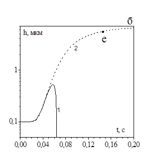 Рис.1. Часові залежності температури вольфрамового провідника (а) та товщини окислу на його поверхні (б) при потужності електричного струму