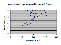 Рисунок 2 – Поле рассеяния «мощность автомобиля-цена» На основе табл. 1 исходных данных для вычисления оценок параметров моделей составляется вспомогательная табл. 1.1. Воспользуемся формулами и левой частью таблицы 1.1. для нахождения оценок а0 и а1 . Так как n = 16, получаем