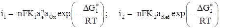 > i разность ( Из сопоставления двух уравнений концентрационной поляризации (перенапряжения диффузии) следует также, что при больших плотностях тока значения перенапряжения в процессе коррозии металлов во много раз меньше значений, получающихся при протекании реакций с доставкой реагентов к поверхности электрода из раствора (или расплава) [30, 31]. 1.5.3 Электрохимическое перенапряжение При рассмотрении теоретических сведений о концентрационной поляризации было допущено, что концентрация частиц, участвующих в электродной реакции, мала по сравнению с общей концентрацией раствора, и скорость электродного процесса определяется только доставкой разряжающихся частиц к поверхности электрода. Однако в достаточно концентрированных растворах в условиях перемешивания скорость доставки разряжающихся частиц к электроду настолько велика, что их концентрация практически не отличается от концентрации в глубине раствора. В данном случае поляризация электрода определяется замедленностью какой-либо из стадий электродной реакции (ионизация или разряд) и носит, название электрохимической поляризации. Перенапряжение (поляризация) перехода (разряд или ионизация) возникает, как было отмечено выше, когда наиболее медленной стадией электродного процесса является собственно электрохимическая реакция. Скорость катодной и анодной реакций