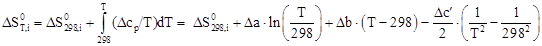 = где cp – теплоемкость соединения, ср, i – теплоемкость составляющего его i – го элемента (с учетом количества атомов). Установлено, что погрешность расчета по данному методу не превышает допустимую при расчете термодинамических величин (8%) [18]. 2.1.2 Методы приближенного расчета энтропии и теплот образования веществ В соответствии с индивидуальной температурной зависимостью теплот образования веществ и их энтропий: