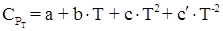 Δa = Δa =16,961·3 + 17,17·2 + 27,3·5,5 + 29,98·5,5 + 16,056·2 = 432,375 остальные коэффициенты ряда рассчитываются аналогично: Δb = 114,338·10-3 Δc` = –36,74·105 cp = 432,375 + 114,338·10-3 ·Т – 36,74·105 /Т2 Определение зависимости теплоемкости от температуры были произведены экспериментальным путем. Чтобы сравнить значения теплоемкости, рассчитанные с помощью рассмотренного метода, и полученные экспериментально [24], представим результаты расчетов, выполненных аналогично рассмотренным, в виде таблицы, а затем построим графики зависимости теплоемкости от температуры. Таблица 2.2 – Результаты расчета изобарной теплоемкости