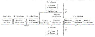 Рис. 1. Класифікаційна схема соснових типів лісу (В. М. Сукачов). Проте вона має недоліки (рис. 2): 1) не всі типи лісу вкладаються в цю схему; 2) ялина майже не входить в зону дуба, а в природі досить часто росте разом із ним; 3) чорниця має широку екологічну амплітуду і може зростати не тільки на вологих (за В. М. Сукачовим), але й на свіжих ґрунтах.