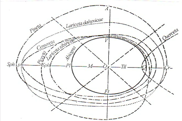 Рис. 2. Узагальнююча класифікація типів лісу – едафофітоценотичні ареали деревних порід В. М. Сукачова. Едафофітоценотичні схеми відображають зв'язок типів лісу з багатством і зволоженням ґрунту, а також можливі взаємозв’язки різних типів лісу. Тип лісу визначається тільки для покритої лісом площі. Під поняттям "тип лісу" П. С. Погребняк розумів "усі ділянки лісу і навіть вирубки, що підлягають залісненню, з екологічно-однорідними умовами". На цій основі він побудував едафічну сітку лісів по двох ординатах: трофність і зволоження. Кожна ділянка є відображенням одночасно і трофотопних, і гігротопних умов і називається едафотопом [36]. П. С. Погребняк виділяє корінні і похідні насадження. Корінний тип лісу визначається за типовою породою. Наприклад, вологий дубово-сосновий субір. Похідний тип лісу – за назвою фактично зростаючої породи. Наприклад, сосняк вологого дубового субору. Однак класифікація типів лісу має недоліки: 1. Віднесення до одного типу лісу ділянок з різними деревними породами і навіть без таких назавжди виправдана. 2. Поняття "бір" і "болото" в сітці поєднуються – в дійсності вони несумісні, а часто протилежні за своєю природою. 3. Автор не вважає рослинність головною типологічної ознакою, а використовує їх тільки як індикатор умов зростання. В дійсності умови середовища в березових і дубово-соснових лісах навіть на однакових грунтах – зовсім різні (мікроклімат, освітлення, трав’яний покрив тощо); важко практично розрізнити свіжі, вологі і сирі типи лісу [36]. Новий крок в розвитку класифікації лісів за типами, провів П. С. Погрeбняк, що відіграли велику роль у розвитку вчення про типи лісу і має також практичне значення [25].Отже, екологічна типологія лісу за П. С. Погребняком є системою типів умов зростання. Поняття "тип лісу" включає не тільки ділянки лісу, але й території, що підлягають залісненню. Едафічна сітка лісів побудована на двох ординатах, які відображають трофність і зволоження ґрунтів. Кожна ділянка одночасно є трофотопом (бори, субори, складні субори, діброви) і гігротопом (дуже сухі, сухі, свіжі, вологі, сирі, болота) і називається едафотопом. За останній час значно посилився антропогенний вплив на ліси – тут проходять швидкі зміни. Тому назріла необхідність розглядати тип лісу не тільки в природі, але й у часі, тобто сучасна типологія повинна бути динамічною. Об’єктом типологічного вивчення зараз стають не тільки праліси. А більшою мірою ліси, змінені людиною, внаслідок різних видів рубок, пожеж, лісокультурної діяльності тощо.