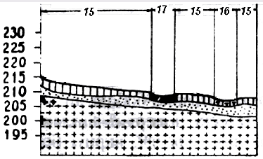 Рис. 4. Схема ландшафтного профіля. І. Геологічна основа: 1. Граніти і мігматити; 2. Піски. ІІ. Ґрунти: 3. Дерново-підзолисті; 4. Лучно-болотні. ІІІ. Рослинність: 5. Ліщина звичайна; 6. Дуб звичайний; 7. Граб звичайний; 8. Зелені мохи; 9. Сосна звичайна; 10. Кульбаба лікарська; 11. Осока болотна; 12. Ялина європейська; 13. Культурна рослинність; 14. М’ята лучна 15. Поверхні зі слабким нахилом на північ, на флювіо-гляціальних відкладах, вкриті вологими судібровами з ожикою сизою, малиною звичайною та ліщиною звичайною в підліску на дерново-слабопідзолистих і супіщаних ґрунтах. 16. Заболочені зниження з зелено-мохово-ситниково-очеретяно-осоковими угрупованнями з домішкою берези пухнастої на болотних, оторфованих у верхніх горизонтах ґрунтах. 17. Слабоврізані долини струмків і їх русла, вкриті осоково-злаково-різнотравними угрупованнями на дерново-лучних, дернових і лучно-болотних огляєних ґрунтах. Більшість геокомплексів є господарськими об’єктами діяльності людини, яка внесла серйозні зміни в ряд ПТК (вирубка лісів, меліоративні канали, дороги, населення тощо). Висновки 1. Лісові екосистеми (біогеоценози) Корецького лісництва знаходяться на південному сході Рівненщини Новоград-Волинського ландшафта – Стави-Корчицького межиріччя. 2. Територія дослідження має найбільш сприятливі багаті лісорослинні умови для росту і розвитку лісів (достатня кількість опадів в теплий період – 400 мм. рт. ст., багаті на поживні речовини ґрунтоутворюючі породи: лесовидні суглинки, елювій кристалічних порід, різноманітні водно-льодовикові відклади). 3. Лісові насадження Корецького лісництва за типологічними ознаками (А. Погребняка) є наступними: а) С3 (Г, С Д) – вологий сосново-дубово-грабовий субір – 62 %; б) С3 (Г Д) – волога грабово-дубова судіброва – 6,4 %; в) С2 (Г, С Д) – свіжа сосново-дубово-грабова судіброва – 3,1 %; г) С4 (Вл (ч)) – сирий чорновільховий сугрудок – 3 %; д) В3 (С Д) – вологий сосново-дубовий субір – 2,6 %; е) В4 (С Д) – сирий сосново-дубовий субір – 1,5 %; ж) С4 (Г, С Д) – сирий сосново-дубово-грабова судіброва – 1,5%; з) В2 (С Д) – свіжий сосново-дубовий субір – 0,3 %; є) С5 (Вл (ч)) – заболочений чорновільховий сугрудок – 0,1 %; и) болота – 2 %; й) луки – 10 %. 4. Найпоширенішими типами грунтів на території дослідження є дерново-підзолистий – 47 % та дерновий – 41 %. Менш значні – болотні грунти – 9 %, лучно-болотні – 2 % та болотно-підзолисті грунти – 1 %. 5. Штучно створені лісові насадження (лісові культури) становлять 40 %, а природних – 60 %. 6. Вікова характеристика насаджень Корецького лісництва: - молодняки – 12 %; - середньовікові – 20 %; - достигаючи – 35 %; - стиглі – 15 %; - перестояні – 18 %. Рекомендації 1. Посилити боротьбу з пожежами, випасом худоби біля лісу, вирубкою лісів. 2. Провести обстеження червонокнижних видів рослин та тварин, з тим, щоб створити заповідну територію місцевого значення. 3. Регламентувати збір, заготівлю не деревних продуктів лісу. Використана література 1. Атлас Ровенської області. – М.: „ГУГК", 1985. – 32 с. 2. Атлас природных условий и естественных ресурсов УРСР. 3. Андрієнко Т.Л. Край лісів та імлистих болід: Розповідь про природоохоронні об’єкти Ровенської області / Т.Л. Андрієнко, Т.М. Антонова – Львів "Каменяр", 1988. – 86 с. 4. Береговий П.М., Прахов М.Н. Ботанічна географія. Київ: "Вища школа", 1989. 5. Буктынов А.Д. Леса. – М.: „Мисль", 1981. – 316 с. 6. Біостратеграфічні критерії розчленування та кореля