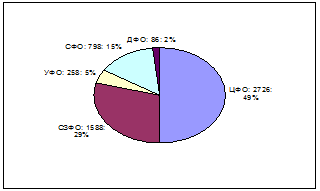Рисунок 1 - Распределение количества прибывших граждан трудоспособного возраста по программе добровольного переселения в Российскую Федерацию соотечественников, проживающих за рубежом В отчетном периоде в Калининградской области на переобучение были направлены 93 и на повышение квалификации 21 участник программы. На переобучение были направлены 36 и на повышение квалификации 16 членов семей участников программы. За этот же период безработными были признаны 108 человек, что составило 26,8% общего числа обратившихся в органы службы занятости, из них 64 участника программы и 44 члена семей участников. В Центральный федеральный округ в 2009 году прибыло 2726 человек трудоспособного возраста, из них 1789 участников программы и 937 членов их семей. В службу занятости по вопросам трудоустройства обратилось 1664 человека (61,0% от числа прибывших), в том числе 1224 участника программы (68,4% от числа прибывших участников) и 440 членов их семей (47,0% от числа прибывших членов семей). Из участников программы в отчетном периоде было трудоустроено 166 человек на предварительно подобранные рабочие места в рамках региональной программы переселения и 634 человека на иные рабочие места, из них 380 человек по направлению службы занятости. Доля трудоустроенных участников программы составило 44,7% от общего числа прибывших участников программы на территорию Центрального федерального округа в отчетном периоде. За этот же период было трудоустроено 205 членов семей участников программы (21,9% от числа прибывших на территорию округа в отчетном периоде членов семей), в том числе по направлению органов службы занятости 125 человек. В отчетном периоде в Центральном федеральном округе 22 участника программы были направлены на профобучение, из них 8 человек за счет субвенций и 14 человек - за счет иных источников, на переобучение направлено 10 человек и на повышение квалификации 8 человек. Членов семей участников программы направлено: на повышение квалификации 2 человека, на профобучение - 20 человек и на переобучение - 9 человек. В 2009 году безработными были признаны 60 человек, что составило 3,6% из общего числа соотечественников, обратившихся в органы службы занятости, из них 39 участник программы и 21 член семей участников. В течение отчетного периода с учета в связи с трудоустройством снято 43 человека, в том числе 27 участника программы и 16 членов семей участников программы. В составе Центрального федерального округа в реализации программы по содействию добровольному переселению в Российскую Федерацию соотечественников, проживающих за рубежом, принимают участие, Воронежская, Калужская, Курская, Липецкая, Тамбовская и Тверская области.