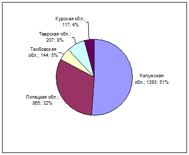 Рисунок 2 - Распределение количества прибывших граждан трудоспособного возраста по программе добровольного переселения в Российскую Федерацию соотечественников, проживающих за рубежом, по Центральному федеральному округу В отчетном периоде в Курскую область прибыло 117 человек трудоспособного возраста, в том числе 72 участника программы и 45 членов семей участников. В службу занятости региона по вопросу трудоустройства обратились 21 человек: 17 участников программы и 4 члена семьи участника. Было трудоустроено на предварительно подобранные места 11 и на иные рабочие места 2 человека, в том числе 11 человек по направлению службы занятости. Трудоустроено 2 члена семьи участника, в том числе по направлению службы занятости трудоустроен 1 член семьи участника программы. Необходимо отметить, что за отчетный период в регион поступило 284 анкеты от соотечественников, желающих переселится в данный регион. Изъявили желание участвовать в реализации программы переселения 284 участника программы и 332 члена их семей, в том числе 147 человек трудоспособных. Распоряжением правительства Российской Федерации от 1 июня 2009 г. №756 – р согласован проект программы Воронежской области по оказанию содействия добровольному переселению в Российскую Федерацию соотечественников, проживающих за рубежом, и определены территории вселения. Работа по реализации программы начнется после принятия соответствующих региональных документов. Постановлением правительства Воронежской области от 21 сентября 2009 г. № 798 утверждена областная целевая программа по оказанию содействия добровольному переселению в Воронежскую область соотечественников, проживающих за рубежом. Управление занятости населения Воронежской области утверждено уполномоченным органом, ответственным за реализацию программы на территории области. В 2009 году в Калужскую область по программе прибыло 1393 человека трудоспособного возраста, из них 955 участников программы и 438 членов их семей. В службу занятости по вопросам трудоустройства обратилось 754 человека (64,1% от числа прибывших), в том числе 597 участников программы (62,5% от числа прибывших участников) и 157 членов их семей (35,8% от числа прибывших членов семей). Из числа участников программы в отчетном периоде было трудоустроено 6 человек на предварительно подобранные места и 389 человек на иные рабочие места, из них 185 человек - по направлению службы занятости. Доля трудоустроенных участников программы составила 41,4% от общего числа прибывших на территорию Калужской области участников программы в отчетном периоде. Трудоустроено 94 члена семей участников программы (21,5% от числа прибывших на территорию Калужской области в отчетном периоде членов семьи), в том числе по направлению органов службы занятости 49 человек. В отчетном периоде в Калужской области 1 участник программы был направлен на повышение квалификации за счет субвенций и 2 на переобучение. На повышение квалификации за счет субвенций направлен и 1 член семьи участника программы. Безработными были признаны 9 человек из общего числа обратившихся в органы службы занятости участников программы и членов их семей. С учета в связи с трудоустройством снято 6 человек. В январе – декабре 2009 года в Липецкую область по программе прибыло 865 человек трудоспособного возраста, из них 541 участник програм
