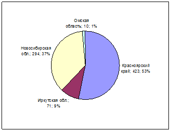 Рисунок 3 - Распределение прибывших граждан трудоспособного возраста по программе добровольного переселения в Российскую Федерацию соотечественников, проживающих за рубежом, по Сибирскому федеральному округу В январе – декабре 2009 года 1 участник программы и 3 члена семьи участников программы, обратившихся в органы службы занятости, были признаны безработными. В Иркутскую область за отчетный период по программе прибыл 71 человек трудоспособного возраста, в том числе 51 участник региональной программы и 20 членов их семей. В службу занятости по вопросам трудоустройства обратились 52 человека, в том числе 40 участников программы и 12 членов семей участников. Из числа участников региональной программы в отчетном периоде было трудоустроено по направлению службы занятости населения 14 человек. По направлению службы занятости населения было трудоустроено 4 члена семей участников программы В отчетном периоде в Иркутской области 1 участник программы был направлен за счет субвенций на повышение квалификации, также на повышение квалификации был направлено 2 члена семьи участника. 9 человек (5 участников региональной программы и 4 члена семьи) были признаны безработными. 2 участника программы и 2 члена семьи участника программы сняты с учета безработного после обучения и трудоустройства. В Новосибирской области реализация региональной программы содействия переселению соотечественников начала осуществляться с января 2009 года. За январь – декабрь 2009 года в регион прибыл 294 человека в трудоспособном возрасте, в том числе 214 участников региональной программы и 80 членов семей участников. В органы службы занятости обратилось 275 человек, в том числе 199 участников региональной программы и 76 членов семей участников программы. Трудоустроено 41 участник программы на предварительно подобранное рабочее место и 85 участников на иные рабочие места, из них 27 человек по направлению службы занятости населения. Трудоустроено 22 члена семей участников, в том числе 8 по направлению службы занятости населения. 5 участников программы направлено на повышение квалификации, 3 члена семьи участника программы за счет иных источников направлены на переобучение и 1 на повышение квалификации. 1 участник программы признан безработным. В 2009 году в Омскую область прибыло 10 человек в трудоспособном возрасте, в том числе 4 участника программы и 6 членов семей участников. По вопросу трудоустройства в службу занятости населения обратилось 4 участника программы. Необходимо отметить, что в 2009 году в регион поступило 117 анкет от участников, желающих переселиться в регион из–за рубежа. В составе желающих 287 человек, в том числе 117 участников и 170 членов семей участников. В составе Дальневосточного Федерального округа в реализации программы по содействию добровольному переселению в Российскую Федерацию соотечественников, проживающих за рубежом, принимают участие Приморский и Хабаровский края и Амурская область. Распоряжением от 17 октября 2009 №1553 – р правительство Российской Федерации согласовало проект программы Еврейской автономной области по оказанию содействия добровольному пер6еселению в Российскую Федерацию соотечественников, проживающих за рубежом. Работа по реализации программы начнется после принятия соответствующих документов органами власти региона. В 