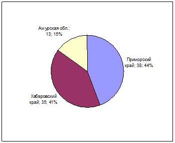 Рисунок 4 - Распределение количества прибывших граждан трудоспособного возраста по программе добровольного переселения в Российскую Федерацию соотечественников, проживающих за рубежом, по Дальневосточному федеральному округу В службу занятости по вопросам трудоустройства обратилось 14 человек: 7 участников программы и 7 членов семей участников(16,3% от числа прибывших участников и членов семей). Из участников программы в отчетном периоде было трудоустроено на предварительно подобранные рабочие места 21 человек и на иные рабочие места 18 человек, из них 1 человек по направлению службы занятости. Было трудоустроено 7 членов семей участников программы, в том числе 1 по направлению службы занятости. В отчетном периоде в Дальневосточном федеральном округе было направлено на переобучение за счет субвенций на осуществление переданных полномочий 2 члена семьи участника. Безработными были признаны 6 участников программы и 7 членов семей участников программы. В течение отчетного периода с учета в связи с трудоустройством были сняты 4 участника программы и 2 члена семей участников программы. В 2009 году в Приморский край по программе прибыло 38 человек в трудоспособном возрасте, в том числе 15 участников программы и 23 члена их семей. На предварительно подобранное рабочее место было трудоустроено 15 участников программы и 1 член семьи участника программы. 2 члена семьи участника программы признаны безработными. Остальные показатели работы по программе содействия добровольному переселению соотечественников в регионе отсутствуют. В 2009 году в Хабаровский край по программе прибыло 35 человек трудоспособного возраста, из них 25 участников программы и 10 членов их семей. В службу занятости по вопросам трудоустройства обратилось 9 человек, в том числе 5 участников программы и 4 члена семьи участника программы (25,7% от числа прибывших ). Из участников программы в отчетном периоде было трудоустроено 4 человека на предварительно подобранные рабочие места и 17 человек на иные рабочие места, из них 1 человек по направлению службы занятости. В отчетном периоде трудоустроено 6 членов семей участников программы . В отчетном периоде в Хабаровском крае 2 члена семьи участника программы были направлены на переобучение за счет средств субвенций на осуществление переданных полномочий в сфере занятости населения. Безработными было признано 8 человек: 4 участника программы и 4 человека из числа членов семьи участника программы, обратившихся в органы службы занятости населения. В отчетном периоде 3 участника программы и 2 члена семьи участника сняты с учета в качестве безработного в связи с трудоустройством. В январе - декабре 2009 года в Амурскую область по программе прибыло 13 человек трудоспособного возраста, в том числе 7 участников программы и 6 членов семей участников. За отчетный период 2 участника программы и 1 член семьи участника программы обратились в службу занятости населения по вопросу трудоустройства. За указанный период 2 участника программы были трудоустроены на заранее подобранные рабочие места и 1 на иные рабочие места. На обучение участники программы и члены их семей не направлялись. Безработными были признаны 2 участника программы и 1член семьи участника программы. 1 участник программы снят с учета безработным после окончания учебы. Финансиров