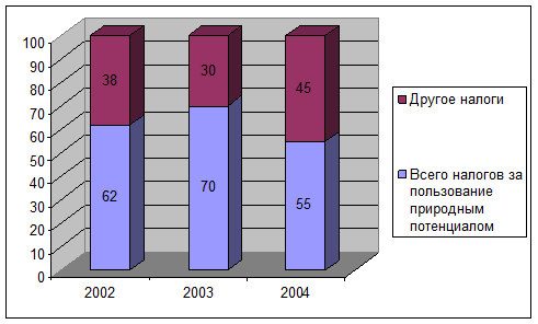 Рис. 2.6. Доля налогов за использование природного потенциала, % Как можно видеть из рисунка 2.6, доля налогов за использование природных ресурсов в консолидированном бюджете Тюменской области велика. Ее динамика за 2002–2004 год обусловлена скорее не развитием промышленности, а изменением налогового законодательства РФ. Рассмотрим этот вопрос подробнее. В объеме консолидированного бюджета Тюменской области платежи за пользование природными ресурсами составляют более 50% собственных доходов, или порядка 12,6 млрд. рублей по оценке 2003 года. Наиболее крупным является налог на добычу полезных ископаемых в виде углеводородного сырья. За счет него обеспечено отчисление в область средств, исходя из норматива в размере 5% налога от сырья в виде нефти, добываемой на территории автономных округов. В 2001–2003 гг. удельный вес налога на добычу полезных ископаемых в общем объеме собственных доходов бюджета составил от 50 до 53%, в абсолютной сумме это 7,9 млрд. рублей в 2001 г., 11 млрд. рублей в 2002 г. и более 12 млрд. рублей в 2003 году. В 2004 году доля поступлений от указанного доходного источника в связи с изменениями в налоговом и бюджетном законодательстве снизилась до 45%. Другим наиболее значимым по величине источником бюджетообразования является земельный налог. Пользование землей в Российской Федерации, как и другими природными ресурсами, платное и осуществляется в форме земельного налога и арендной платы за земли. Собственники земли, землевладельцы и землепользователи, кроме арендаторов, облагаются ежегодным земельным налогом. За земли, переданные в аренду, взимается арендная плата. Целью введения платы за землю является стимулирование рационального использования, охраны и освоения земель, повышения плодородия почв, выравнивание социально-экономических условий хозяйствования на землях разного качества, обеспечение развития инфраструктуры в населенных пунктах, формирование специальных фондов финансирования этих мероприятий. Размер земельного налога не зависит от результатов хозяйственной деятельности собственников земли, землевладельцев, землепользователей и устанавливается в виде стабильных платежей за единицу земельной площади в расчете на год. Несмотря на то, что на основании Закона Российской Федерации «Об основах налоговой системы в Российской Федерации» земельный налог является местным, до 2003 года он подлежал зачислению в федеральный бюджет в соответствии с нормативами, установленными законами о федеральном бюджете на соответствующий финансовый год в следующих размерах: 2001 год – 30%; 2002-й – 15%. С 01.01.2003 года земельный налог в размере 100% зачисляется в бюджеты субъектов Российской Федерации. Также с этого момента в связи с отменой налогов на пользователей автомобильных дорог и с владельцев транспортных средств земельный налог в части, подлежащей зачислению в областные бюджеты, в размере 100% является одним из источников формирования территориальных дорожных фондов. Кроме этого, в соответствии с законодательством Российской Федерации ежегодно производится индексация ставок земельного налога и размеров арендной платы. Но следует учитывать, что после разграничения государственной собственности на землю и образования собственности федеральной, субъектов Российской Федерации и муниципальных образований плательщики арендн