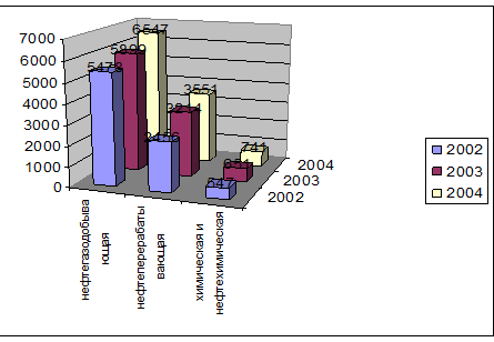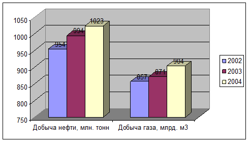 Рис. 2.7. Динамика добычи нефти и газа в Тюменской области за 2002–2004 годы Как можно видеть из рисунка 2.7, имеет место положительная динамика добычи двух главных видов сырья в Тюменской области за 2002–2004 годы. Эти данные необходимо сопоставить с уменьшающейся долей нефтегазодобывающей промышленности в общем объеме промышленного производства Тюменской области.
