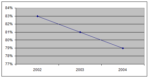 Рис. 2.8. Доля нефтегазодобывающей промышленности в общем объеме промышленного производства Тюменской области за 2002–2004 годах, % Отрицательная динамика, изображенная на рис. 2.8, говорит о развитии других отраслей промышленности в Тюменской области. На мой взгляд, в регионе развита нефтеперерабатывающая промышленность, обеспечивающая легким углеводородным сырьем нефтехимический комплекс страны. В химической и нефтехимической промышленности осуществляется выпуск бутадиена, синтетических смол, пластических масс, полиэтиленовых труб, полимерной пленки. В области производится около трети объемов сжиженного бытового газа страны. На севере развивается комплекс по выпуску моторного топлива, эксплуатируются мини-заводы по выработке моторного масла для местного рынка. Пользуется спросом продукция машиностроительных заводов: нефтепромысловое, буровое, геологоразведочное, нефтеперерабатывающее оборудование, тракторные прицепы, деревообрабатывающие станки, бетоносмесители, аккумуляторы и средства автоматики, медицинское оборудование и запасные части к нему, медицинские иглы и шприцы однократного применения. В промышленности строительных материалов осуществляется выпуск сборных железобетонных конструкций и изделий, деталей для крупнопанельного домостроения, кирпича, стеновых блоков, экологически чистых изоляционных материалов, керамической черепицы и облицовочных плиток. Как мне кажется, важную роль в развитии области играет лесная и деревообрабатывающая отрасль. Изготавливается широкий ассортимент мебели, древесностружечных плит, фанеры клееной, деревянных домов, теплоизоляционных, отделочных и других материалов и изделий из древесины. За 5 месяцев т.г. производство деловой древесины составило 1606 тыс. пл. м3 , пиломатериалов – 509 тыс. м3 , вывозка древесины – 1905 тыс. пл. м3 . Социально-ориентированные отрасли представлены легкой и пищевой промышленностью. Осуществляется выпуск шерстяных тканей, пряжи, изделий из меха, рыболовных сетей, кожаной и валяной обуви, швейных изделий. Организациями пищевой промышленности производится широкий ассортимент мясных, рыбных и молочных продуктов, хлеба и хлебобулочных, кондитерских изделий, консервированной и другой продукции. Приведем динамику объемов промышленного производства по наиболее развитым отраслям промышленности Тюменской области за 2002–2004 годы. Таблица 2.6. Объемы производства наиболее развитых отраслей промышленности Тюменской области в 2002–2004 годах, млрд. руб.
