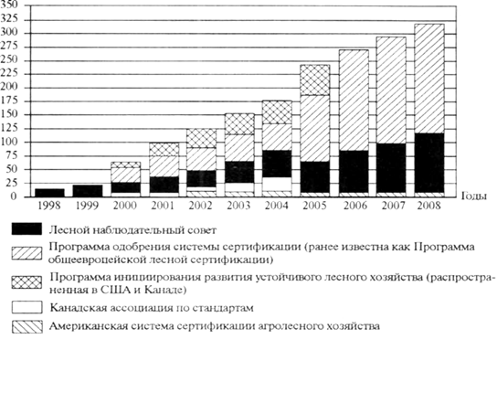 Рис. 1. Динамика площади сертифицированных лесов в разрезе основных схем сертификации Экологическая сертификация лесов - это добровольный приоритетный экономический инструмент лесной политики, используемый для оценки соответствия производственно-хозяйственной деятельности лесных предприятий требованиям экологических стандартов и концепции устойчивого экологически-сбалансированного развития лесного хозяйства, технологических процессов воспроизводства и использования лесных ресурсов и продукции лесного хозяйства. Опыт экологической сертификации лесов промышленно развитых стран и глобальные экологические угрозы окружающей природной среде свидетельствуют об объективной необходимости экологической сертификации не только лесов, но и окружающей среды в целом. Чтобы такая процедура стала успешной, она должна получить признание на всех уровнях управления природными ресурсами. Экологическая сертификация окружающей природной среды, по нашему мнению, — добровольная процедура, которая позволит определить соответствие ведения природопользователями производственно-хозяйственной и другой деятельности на отдельных объектах требованиям экологических стандартов, а также экологической политике (международной, национальной, региональной), которая должна получить законодательное признание. Экологическая сертификация должна: - охватывать все природные объекты, размещенные на данной территории, а также объекты антропогенного происхождения, влияющие на уровень экологической безопасности; - оценивать: экологическое состояние природных объектов; экологичность технологических процессов воспроизводства, охраны, защиты и использования природных ресурсов; экологичность продукции и услуг; уровень экологической безопасности; - обеспечить составление государственного реестра экологически опасных природных и антропогенных объектов и осуществление мер, направленных на укрепление экологической безопасности; - опираться на национальные схемы экологической сертификации окружающей природной среды, национальные и международные (признанные Украиной) экологические стандарты, национальные критерии и индикаторы оценки состояния окружающей природной среды, принципы национальной экологической политики. 5. Глобализация или закрытые экономические системы? Слабо развитые страны в продвижении к повышению эффективности национальной экономики стоят перед выбором: или не вписываться в глобальные интегральные процессы производства материальных благ (сохраняя национальную идентичность и самобытность), или вписываться в глобальные международные процессы, утрачивая в то же время национальный суверенитет, а с ним - остатки национальной культуры, обедневший национальный язык и т. д. Необходимо иметь в виду, что разрушение малых национальных экономик и культур будет иметь для земной цивилизации такие же отрицательные последствия в будущем, как утрата биоразнообразия для природной окружающей среды. Глобализация вместе с отдельными конструктивными факторами характеризуется деструктивными последствиями. Поданным Всемирного банка, в 1973 г. разрыв в прибылях между самыми богатыми и самыми бедными странами определялся соотношением 44:1. Глобализация позволила развитым странам и крупнейшим транснациональным корпорациям во