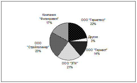 Рис. 6 На основе данных диаграмм мы можем сделать вывод по структуре потребления. Итак, мы можем отметить, что рынки г. Самары занимают лидирующее положение по сбыту герметиков ООО «Герметекс», на 2-ом месте находится г.Сызрань. Таким образом, потребление носит в основном локальный характер и сосредоточено большей частью в Самарской области, хотя мы видим, что в последнее время фирма ведёт работу по выходу на новые рынки. 2.3 Анализ конкурентоспособности предприятия на рынке герметических материалов На европейском рынке опыт использования пен и герметиков насчитывает уже более 40 лет, в России – всего 15. Значительную долю продаж герметизирующих материалов в России составляет импорт из Голландии, Германии, Бельгии, Чехии, Польши, Италии. Опыт последних лет показывает, что далеко не все отечественные предприятия готовы к ведению конкурентной борьбы. Многие, даже обладая конкурентоспособной продукцией, из-за отсутствия практики использования всего комплекса маркетинга, не могут реализовать это преимущество. Вместе с тем конкурентная ситуация с каждым годом все более осложняется постепенным расширением границы рынка и вовлечением в него западных фирм, имеющих значительный опыт в условиях жесткой конкуренции. Прямое использование этого опыта на российских предприятиях часто затруднено из-за отсутствия универсальных схем конкурентного поведения на рынке. В современных условиях каждому предприятию особенно важно правильно оценить создавшуюся рыночную обстановку с тем, чтобы предложить эффективные средства конкуренции, которые, с одной стороны, отвечали бы сложившейся в России рыночной ситуации и тенденциям ее развития, с другой стороны – особенностям конкретного производства. В процессе сравнительного анализа конкурентных преимуществ ООО «Герметекс» в состав конкурентной среды были включены следующие предприятия, производящие продукцию, аналогичную продукции ООО «Герметекс»: 1) ООО "Гермаст" (г. Санкт-Петербург); 2) ООО "Стройполимер" (г. Рязань); 3) ООО "Филикровля" (г. Москва); 4) ООО "ЗГМ" (г. Дзержинск). Производственные мощности завода позволяют выпускать до 500 километров ленты и 120 тонн герметика в месяц. Представительства ЗАО "Гермаст" работают в Москве, Челябинске, Новосибирске, Красноярске, Комсомольске-на-Амуре. ООО «Завод герметизирующих материалов» – один из крупнейших в России производителей неотверждаемых самоклеящихся герметиков и технологий герметизации на их основе. Неотверждаемые герметизирующие материалы серии Абрис® и технологии герметизации на их основе применяются в целях гидро-, пароизоляции, антикоррозионной защиты поверхностей, вибро-, шумоизоляции. Завод герметизирующих материалов динамично развивается. Сегодня, ООО «ЗГМ» входит в первую тройку отечественных производителей герметизирующей продукции. Рязанский завод строительных материалов и красок ООО "Стройполимер" успешно работает на рынке строительных материалов с 1992 года. Предприятие производит и реализует бутилкаучуковые самоклеящиеся герметизирующие ленты Липлент, используемые в строительстве, ремонте и реконструкции зданий различного назначения. Компания "Филикровля" (г. Москва) более 80 лет специализируется в области производства гидроизоляционных, кровельных и герметизирующих материалов. В настоящее время основная область д