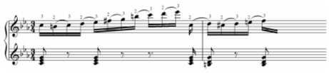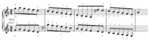 В свое время «трехпалая» аппликатура была оправданным шагом и сыграла полезную роль в пианистической практике. При тогдашних приемах игры – сочетании легатности с почти неподвижной рукой – это избавляло пианистов от некоторых неразрешимых проблем (подкладывание первого пальца после пятого и четвертого»). В последующие десятилетия в пианистических приемах произошли значительные перемены: legato стало менее «связанным», его место частично заняло nonlegato, рука получила свободу движений, начал широко применяться «собирающий» бросок руки к пятому пальцу. В этих условиях первый палец может не подкладываться, а перебрасываться через четвертый или пятый. Слабость последних пальцев компенсируется переносом в их сторону центра тяжести руки при помощи собирательного движения. Тогда приведенные выше примеры выглядят обоснованно и удобоисполнимо. А использование «трёхпалой» аппликатуры все более утрачивает свое разумное основание. Насколько можно считать «пятипалую» аппликатуру боле догматичной можно считать по следующему примеру: