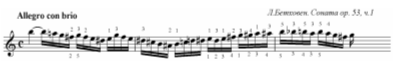 В сонате №3 Бетховена арпеджио legato переходит на гребне динамической волны в нисходящий гаммаобразный пассаж staccato. Здесь 4-й палец на Ми отрицательно сказывается на звучании Фа-диеза, взятого 3-м пальцем в нисходящей гамме. Этот Фа-диез «проваливается» в общем движении низвергающихся звуков. А вот в нижеследующем примере Бетховена в связующей партии «Авроры» верхняя аппликатура предпочтительнее (нижняя взята из редакции Лямонда), так как сочетание 1-го, 3-го, 5-го пальцев на мелодической вершине пассажа лучше, чем 3-го, 4-го, 5-го: