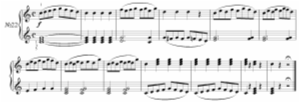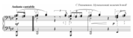 Иногда палец подменивается непосредственно перед нажатием последующей клавиши. Пример Глинка вариации «Среди долины ровныя». В первом такте подмену в мелодии 5-го пальца 4– м целесообразно совершить одновременно со взятием звука ми в среднем голосе: