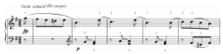 5) При выборе аппликатуры следует руководствоваться также естественными особенностями пальцев. Большой палец – наиболее «тяжёлый» - его уместно применять для извлечения особенно насыщенных звуков. Четвертый – там, где требуется некоторая утонченность звучания и т.д. Этот принцип аппликатуры был разработан ещё пианистами – романтиками. Знакомить с этим принципом можно уже продвинутых учеников, так как использование его требует уже владение инструментом. 6) Большие трудности для учеников составляют места, требующие достижения максимальной связности при помощи пальцевого legato. В таких случаях используется подмена пальцев, придающая игре больше плавности. Пример Р.Шуман «Первая утрата» (5такт):