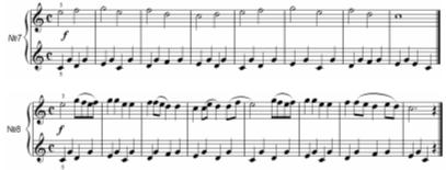 С №7 и №8 легко справиться, если понять строение мелодии в левой руке. Это те же интервалы, только в разложенном виде. Это хороший пример для знакомства с скрытым 2-х голосием:
