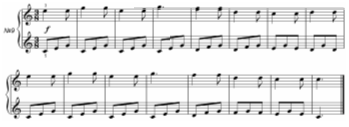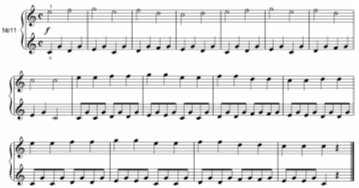 В №11 ускоряется темп за счет смены крупных длительностей на мелкие, при этом строение мелодической линии во втором предложении остается неизменным. Прекрасный пример для тренировки метроритма: