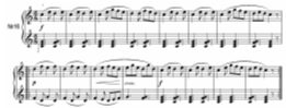 В №14 появляются в левой руке двойные ноты, и исполнение репризы. Здесь контрастная динамика, одновременное использование разных штрихов в обеих руках: