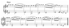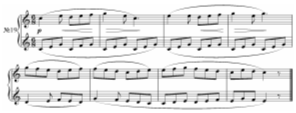 И ещё пример: Мазурка из «Детского альбома» П.Чайковского, где встречающаяся в средней части быстрое последование ре-диез (шестнадцатой) и терции до-ми (четверти) в левой руке значительно лучше удается, если играть терцию не обычной аппликатурой 1-3, а 4-1.