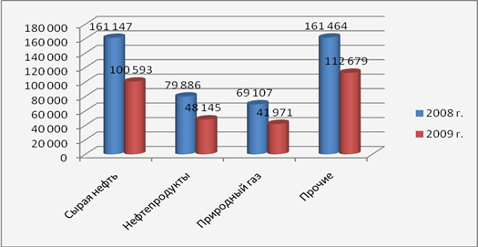 Рис. 2. Счет текущих операций за 2008-2009 гг.(млн. долл. США) Основной причиной сжатия сальдо стало резкое сокращение торгового баланса на 68175 млн. долл. США или на 38 % в 2009 г. по сравнению с началом анализируемого периода – 2008 г. Это вызвано, в первую очередь, падением доходов российских экспортеров вследствие снижения цен на нефть, газ, нефтепродукты, металлы и другие товары сырьевого экспорта.