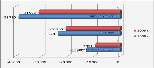 Рис. 3. Экспорт Российской Федерации за 2008-2009 гг. (млн. долл. США) В целом экспорт снизился в 2009 г. по сравнению с 2008 г. на 168215 млн. долл. США или на 37 %. При этом необходимо отметить, что во втором полугодии 2009 г. наблюдалось восстановление экспорта благодаря увеличению цен на экспортные товары. Заметим, что по мере стабилизации ситуации в российской экономике начал восстанавливаться и импорт. При этом если в течение II – III кварталов восстановление импорта товаров происходило медленнее, чем их экспорта, то в IV квартале темп прироста импорта практически достиг 24%, а экспорта – лишь 15%. В случае продолжения данной тенденции возможно возобновление снижения положительного сальдо текущего счета. Баланс экспорта и импорта услуг показывает, что страны не только экспортируют товары, но и предоставляют страховые, транспортные, брокерские, туристические и иные услуги гражданам и фирмам других государств. Одновременно предприятия и граждане этих стран покупают аналогичные услуги у иностранцев. За анализируемый период также произошло снижение отрицательного сальдо баланса услуг: с -24336 млн. долл. США в 2008 г. до -19763 млн. долл. США в 2009 г. Изменение экспорта и импорта услуг за анализируемый период проиллюстрированы рис. 4 и 5.