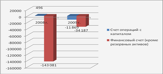Рис. 5. Изменение импорта услуг за 2008-2009 гг. (млн. долл. США) На 37 % снизилось отрицательное сальдо баланса оплаты труда. Отрицательное сальдо баланса инвестиционных доходов снизилось за анализируемый период на 3963 млн. долл. США или на 11%. Перейдем к рассмотрению второй части платежного баланса – счету операций с капиталом и финансовыми инструментами. Что касается сальдо счета операций с капиталом и финансовыми инструментами, то чистый вывоз капитала частного сектора по итогам 2009 г. составил 46 млрд долларов, что значительно меньше по сравнению с чистым оттоком в размере 142,6 млрд, зафиксированным в 2008 г. Таким образом, произошло снижение вывоза капитала на 68 %.